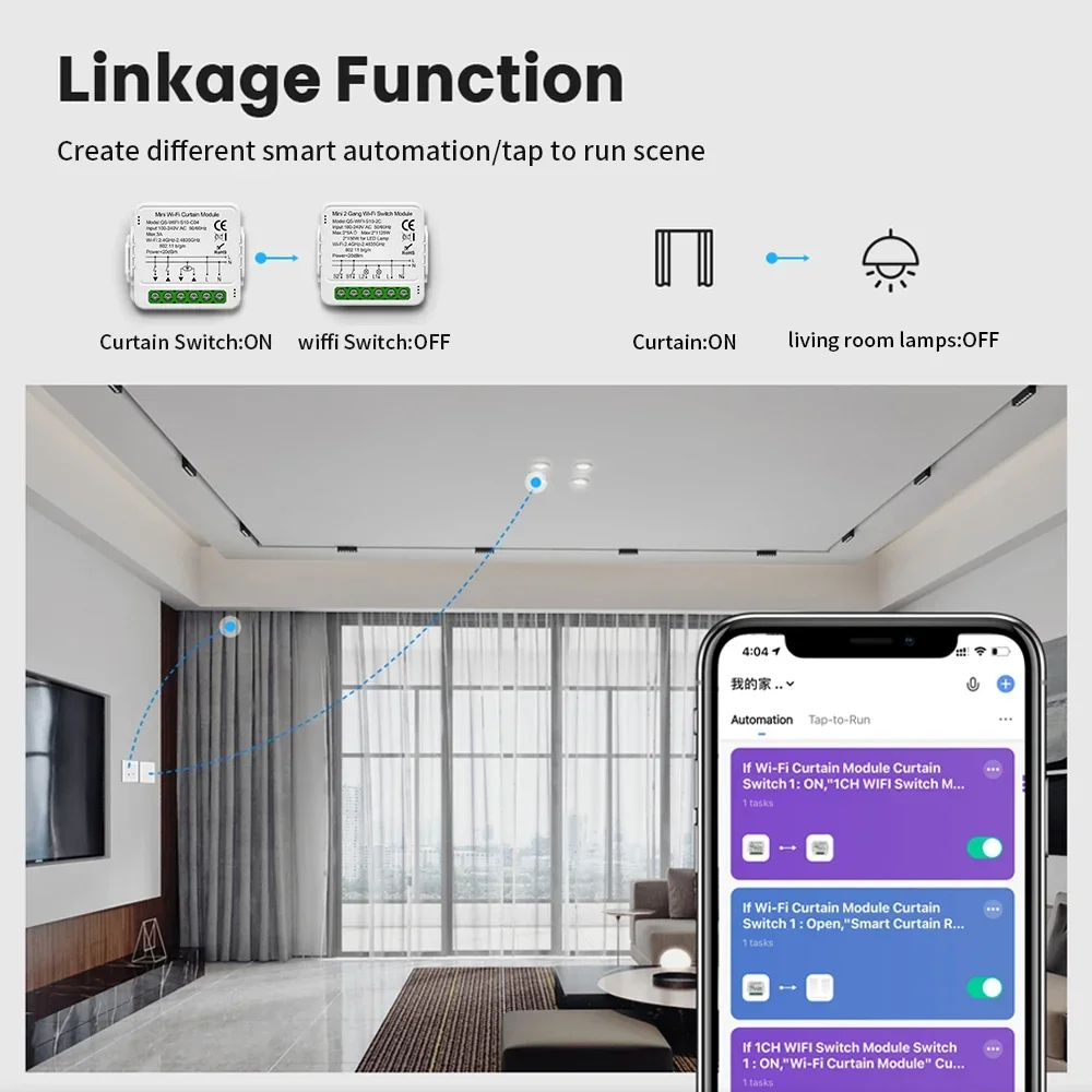 Crea diverse automazioni/tocca intelligenti per eseguire scene. Ad esempio, quando la tenda si accende, il modulo interruttore Wi-Fi spegnerà le lampade del soggiorno.
